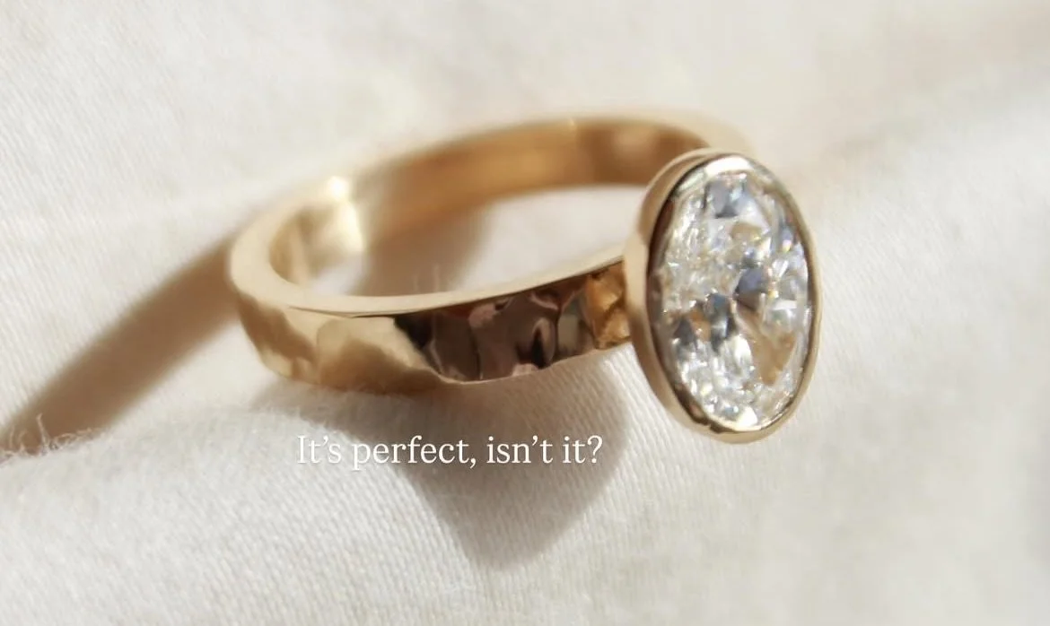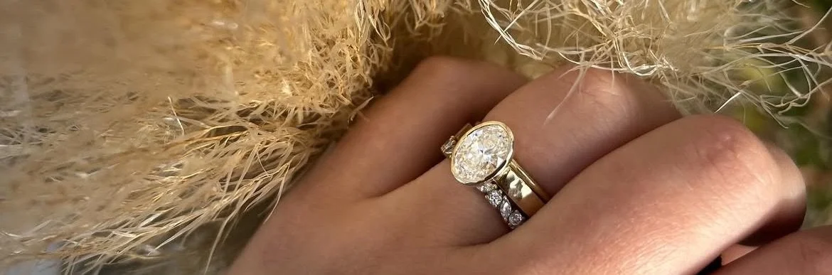 His ring was a dream, and I got to work on it. We sourced the most perfect 1.54ct F Oval Brilliant Diamond together, complete with a softly hammered bezel setting and a 3mm width shank.