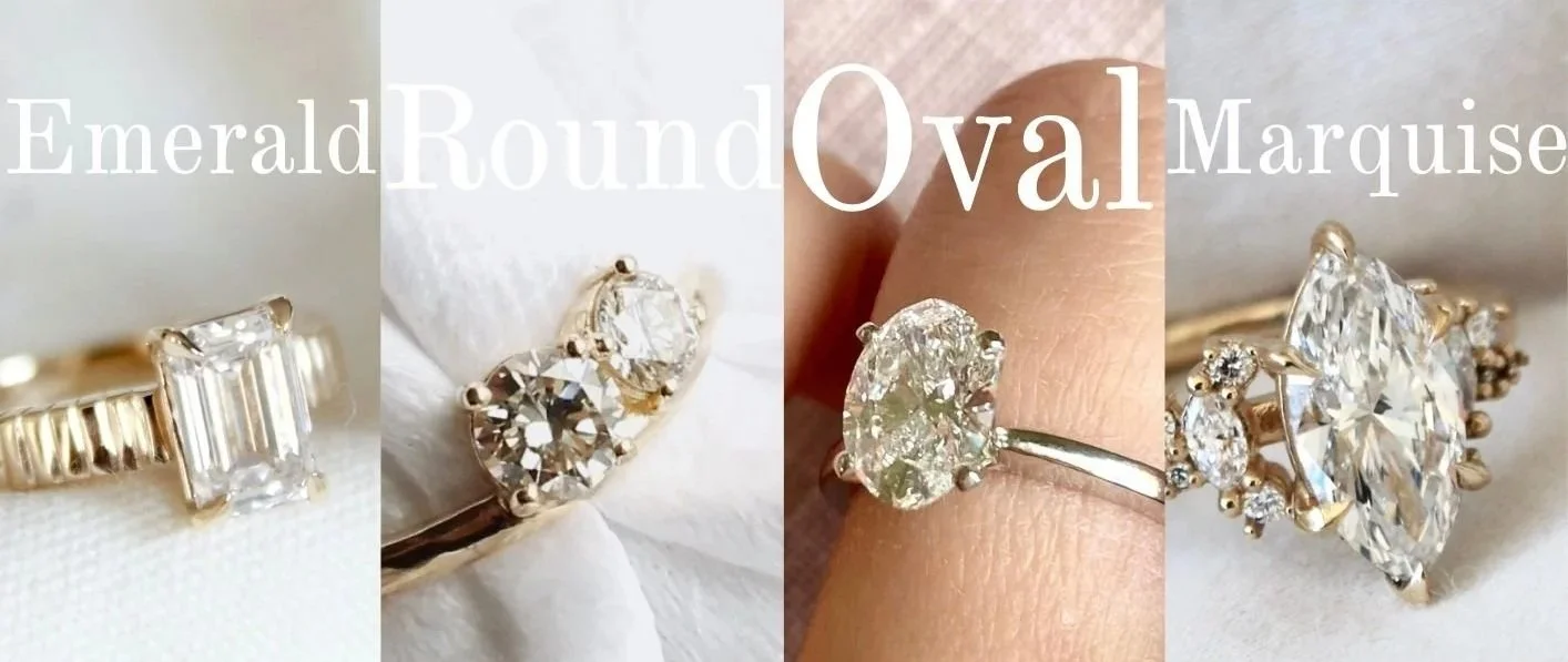 The most common diamond cuts we use are emerald, round, oval, and marquise. We love all the others too: princess, cushion, pear, radiant, heart, trilliant, and baguettes.