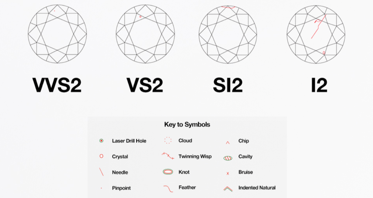 The clarity of your stone is going to measure the inclusions and impurities of your diamond. If there is a spec, chip, or cloud your clarity will tell you. The clarity scale will go from IF all the way to I2/I3. GIA has a wonderful blog about the clarity of diamonds specifically where we got the graphic below.